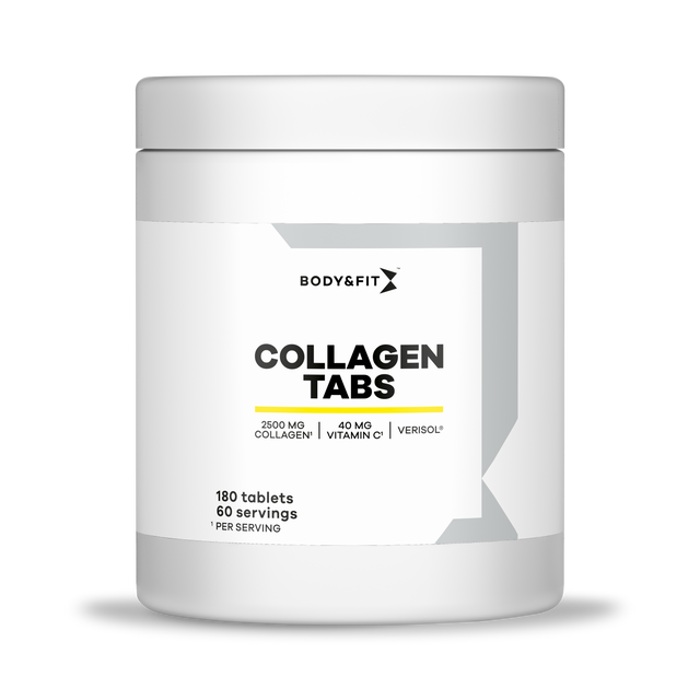 Een dosis van drie Collagen tabletten van Body & Fit levert 2,5 g van de premium bron van collageen Verisol® , die de uitstraling van de huid helpt te verbeteren. Bovendien bevatten de tabletten vitamine C dat de vorming van collageen ondersteunt voor een normale functie van de huid.