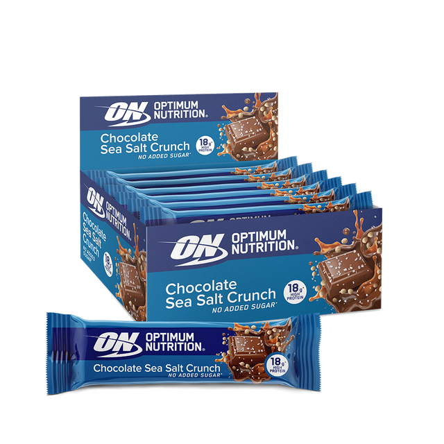 Bringe deinen Körper auf Hochtouren mit dem Chocolate Sea Salt Crunch Proteinriegel von Optimum Nutrition.