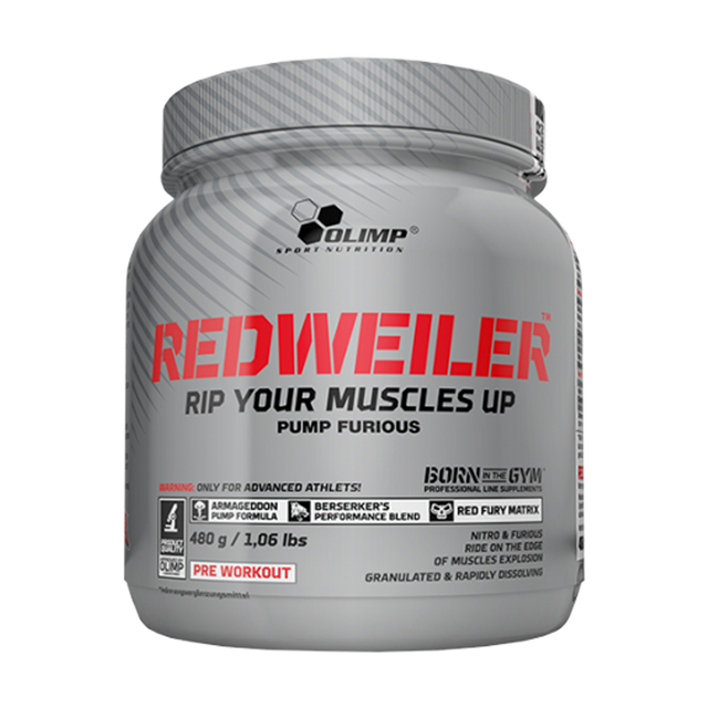 Hol aus deinem Training das Maximum raus mit Redweiler von Olimp – ein echtes ‘all-in-one’ Pre-workout-Pulver für bessere Konzentration und mehr Energie und Leistungsfähigkeit. Redweiler umfasst drei Powerblends: Armageddon Pump enthält L-Arginine AKG und Citrullinmalat; Berserkers Performance enthält Beta-Alanin, Creatin und Vitamin B1 und B3; Red Fury enthält Koffein, L-Tyrosin, Cayennepfeffer und Piperin. Erhältlich in drei megastarken Geschmacksrichtungen.