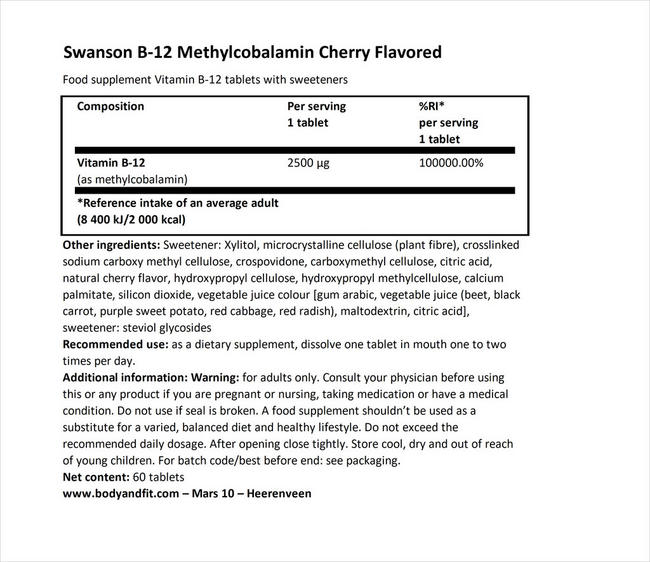 methylcobalamin (vit. B12), other ingredients: (xylitol, microcrystalline cellulose, croscarmellose sodium, crospovidone, carboxy methyl cellulose, citric acid, natural flavouring (cherry), hydroxypropyl cellulose, calcium palmitate, silicon dioxide, colours (gum arabic, purple sweet potato colour), maltodextrin, citric acid, stevia leaf extract)
