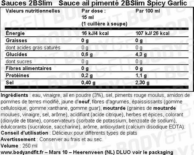 Vous voulez ajouter de la sauce épicée à l’ail à vos salades, sandwiches ou en-cas sans vous soucier des calories ou du sucre ? La sauce épicée à l’ail 2BSlim Spicy Garlic est une savoureuse sauce faible en calories, sans sucre et sans matière grasse. Convient aux végétariens. La sauce épicée à l’ail 2BSlim Spicy Garlic est également sans lactose et sans gluten. Mettez-en une cuillerée sur vos brochettes grillées ou autres en-cas post-entraînement et faites-vous plaisir sans complexe !