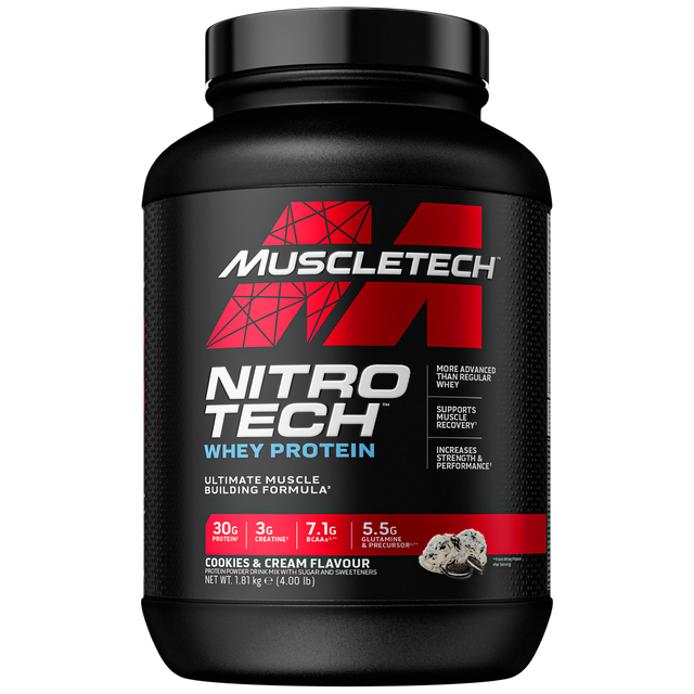 Nitro-Tech is het resultaat van tientallen jaren patenten verwerven en onderzoek doen. Het werk heeft zijn vruchten afgeworpen: Nitro-Tech is een wetenschappelijk ontwikkelde whey eiwitformule, versterkt met creatine* voor een nog betere spier- en krachttoename. Het bevat ook whey eiwit, ons populairste type eiwit. Whey eiwit bestaat uit vertakte keten aminozuren (BCAA's) en essentiële aminozuren (EAA's), en heeft de hoogste biologische waarde (de maatstaf voor hoe goed je lichaam eiwitten opneemt en assimileert).