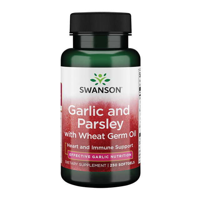 Voedingssupplement, softgels met knoflook, peterselie en tarwekiemen.