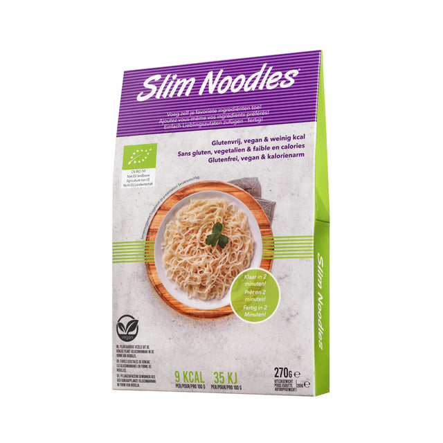 Slim Pasta's zijn gemaakt van een plantaardige vezel uit de konjac plant genaamd glucomannan. Het unieke van deze speciale vezel is dat het het uitzonderlijk laag is in kcal vergeleken met normale pasta, noodles of rijst. Een zakje van 200 gram bevat slechts 18 kcal. Eenzelfde portie gewone pasta van 200 gram bevat daarentegen al snel zo’n 700 kcal! Het eten van de Slim Pasta is een zeer eenvoudige manier om de energie-inname te beperken. Het enige dat je hoeft te doen is je gebruikelijke pasta, noodles en rijst te vervangen voor Slim Pasta.Slim Pasta is zeer makkelijk te bereiden en al binnen 2 minuten klaar!
