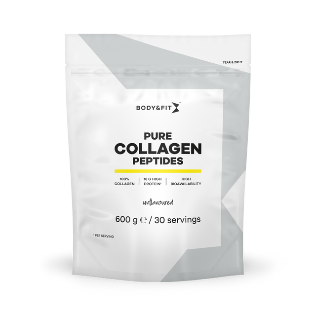 Collageeneiwitten zijn helemaal on trend en niet zonder reden! Pure Collagen Peptiden is smaakloos en bevat 18 gram eiwitten per serving. Eiwitten bevorderen spiergroei, zijn goed voor het skelet en dragen bij tot de instandhouding van de spiermassa. Het biedt de ultieme ondersteuning voor meerdere aspecten in je lichaam en is perfect voor na een training, bij het ontbijt of door je favoriete smoothie. Pure Collagen Peptiden van Body & Fit is een zuiver product zonder toegevoegde kleur-, smaak- en zoetstoffen of conserveringsmiddelen.