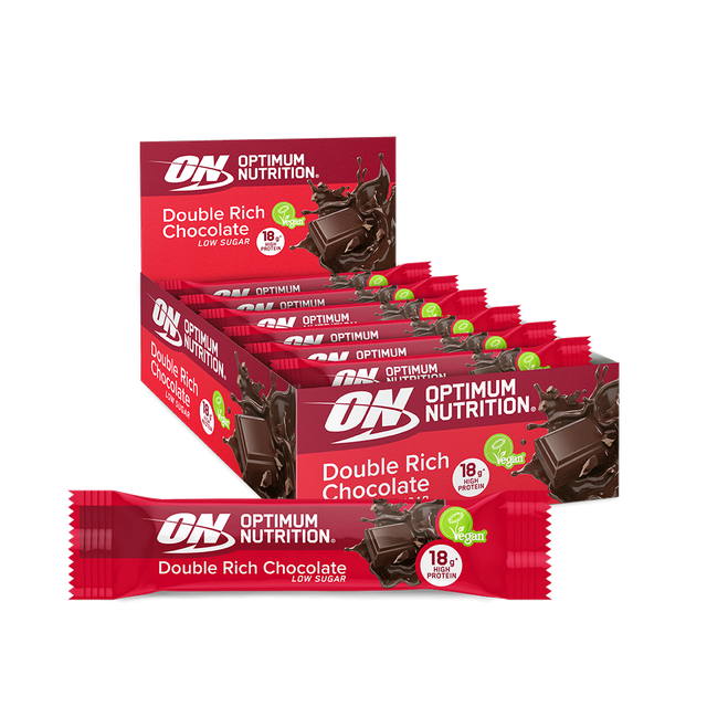Voor een smakelijke en eiwitrijke veganistische snack, kies je voor de Double Rich Chocolate eiwitreep van Optimum Nutrition.