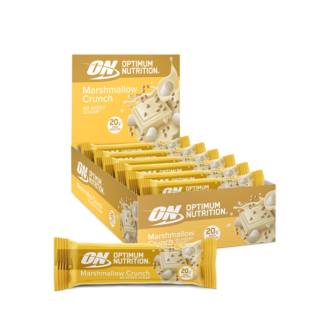 Tank bij met de Marshmallow Crunch eiwitreep van Optimum Nutrition. Als 's werelds nummer 1 in sportvoeding vindt Optimum Nutrition kwaliteit ontzettend belangrijk en weten ze hoe belangrijk het is om je lichaam van het beste te voorzien. Deze reep bevat 20 gram eiwitten van hoge kwaliteit en elke hap zit boordevol laagjes witte chocolade en chips met marshmallowsmaak, zonder toegevoegde suikers*.
