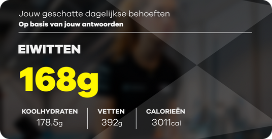 Bekijk onze Privacyverklaring om te lezen hoe wij met jouw gegevens omgaan. Deze calculator is voor personen van 18 jaar en ouder. De eiwitcalculator is alleen bedoeld voor educatieve doeleinden. De aanbevelingen voor calorieën en macronutriënten die deze calculator geeft, zijn schattingen op basis van onafhankelijke wetenschappelijke formules en mogen alleen als richtlijn worden gebruikt. We adviseren mensen die op zoek zijn naar specifieke richtlijnen een sportdiëtist/voedingsdeskundige te raadplegen.
